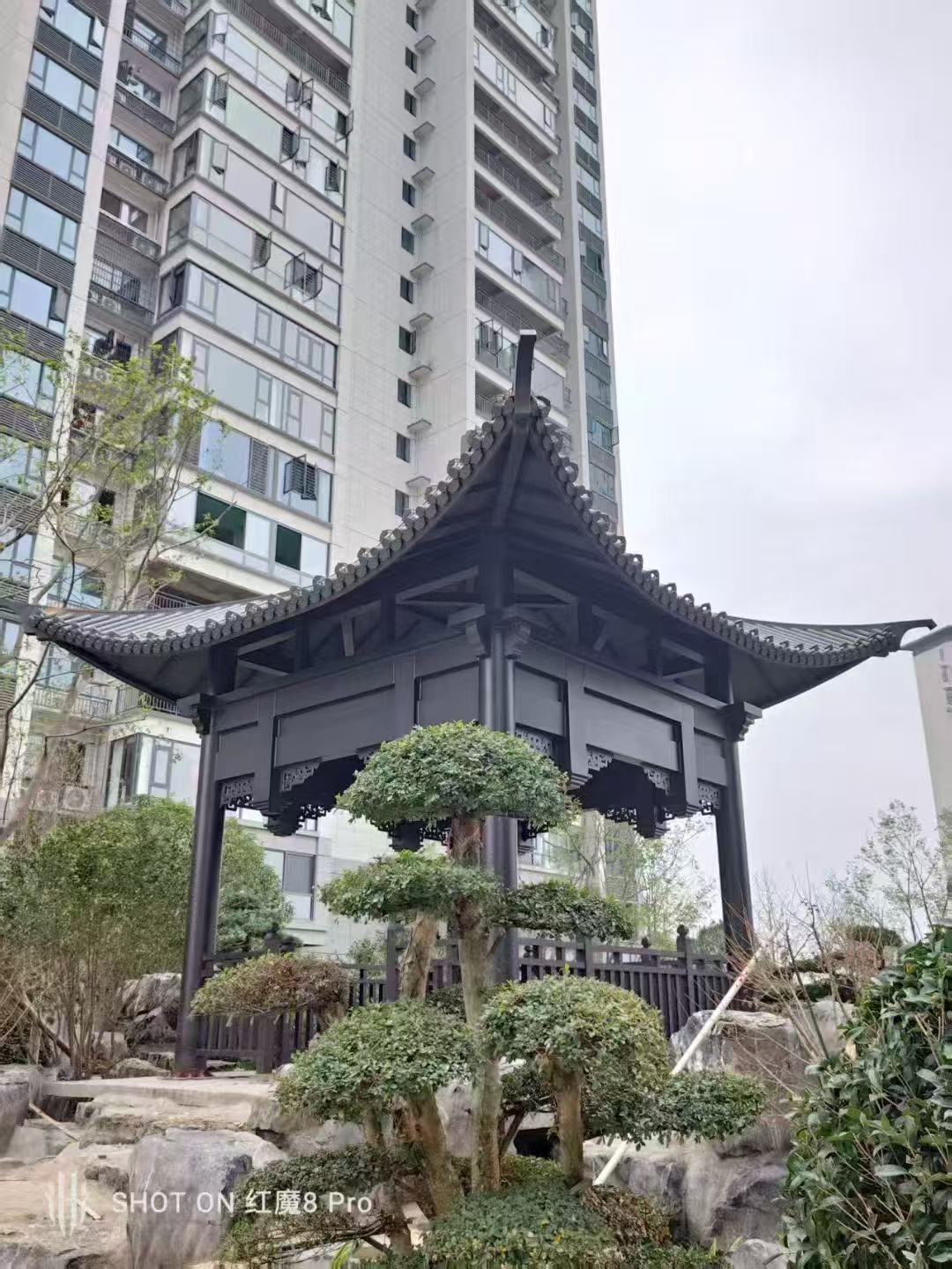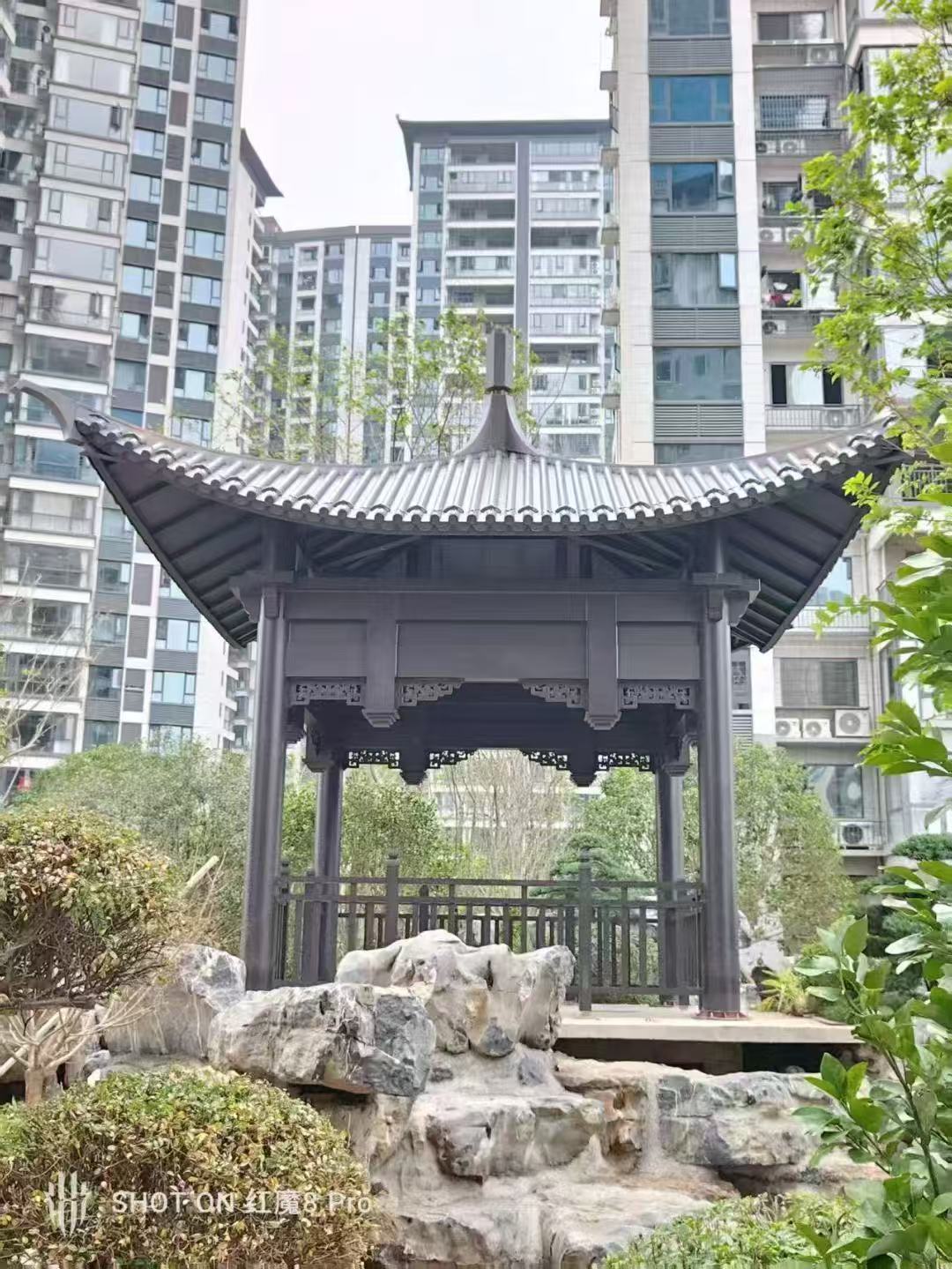 这座铝合金四角凉亭的顶部,采用了精妙绝伦的仿古弯弧设计。那流畅的弧线,宛如历史长河中流淌的诗意,带着一种穿越时空的优雅韵律,缓缓地舒展在公园的天空之下。